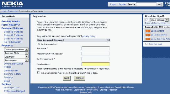 Получив доступ в систему, вы сможете заказать необходимый серийный номер, который будет выслан на ваш e-mail, указанный при регистрации. Процесс получения серийного номера очень прост. Зайдя на сайт компании Nokia: http://forum.nokia.com, с правой стороны Интернет страницы вы найдете ряд ссылок. Ссылка Tools&SDK приведет на страницу, отображающую все доступные на этот момент программные средства. Выбрав необходимый вам программный продукт, например Nokia Developer's Suite 2:0 for J2ME, вы попадете на страницу изображенную, на Рисунок 4.2.